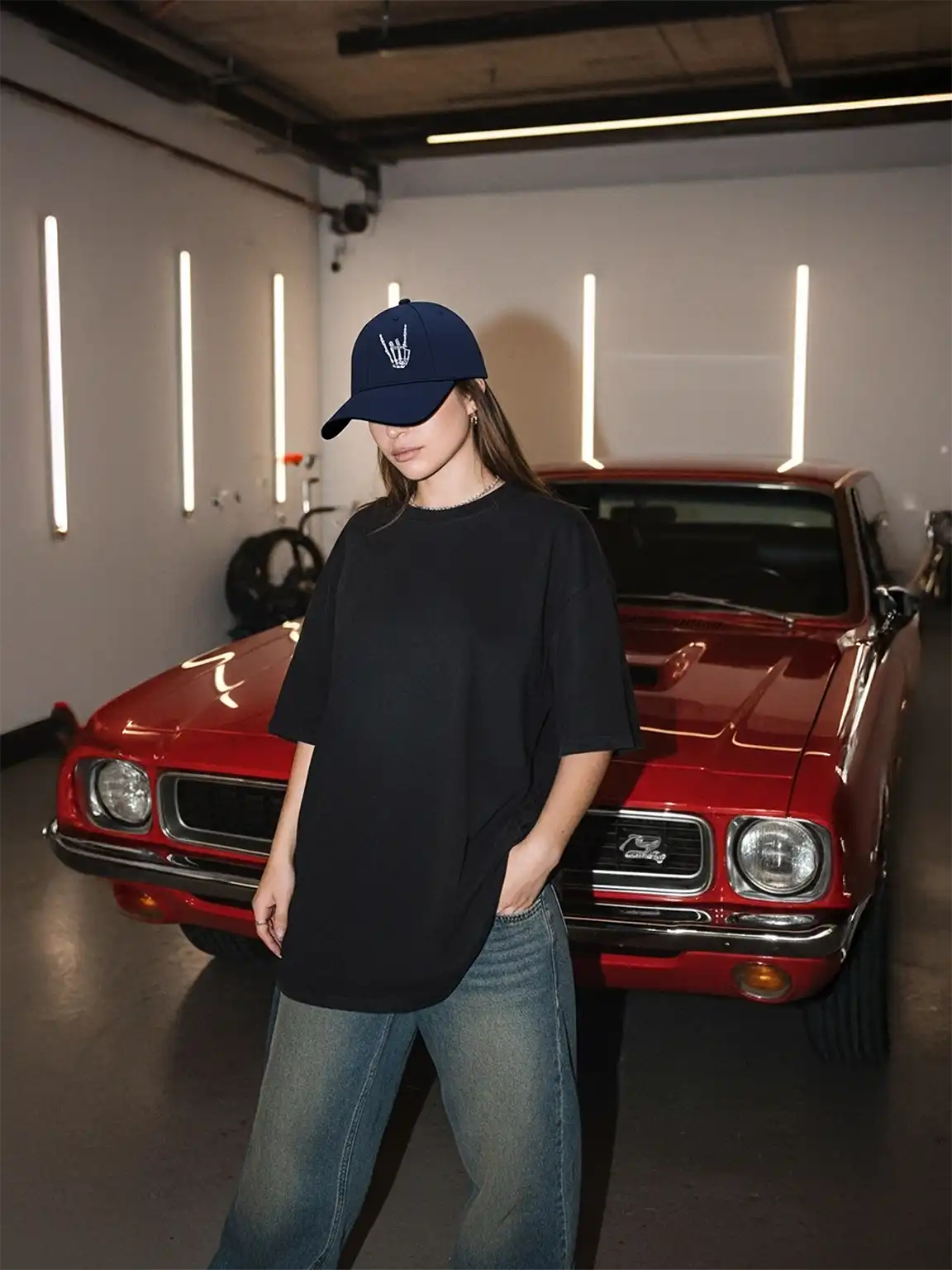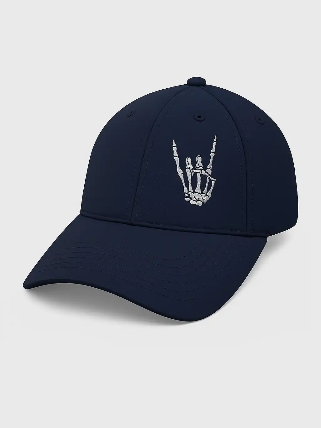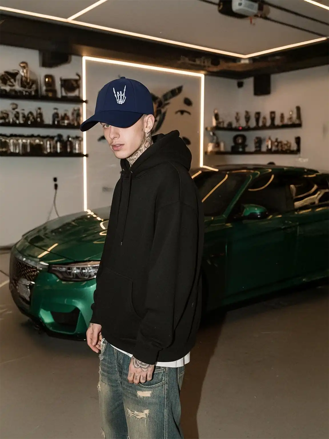 The standout feature of the Skullhand Hat is its bold skeleton hand embroidery. Because of this, it adds a distinctive, edgy detail to any outfit. At the same time, the navy blue color provides a versatile base that pairs effortlessly with casual or streetwear ensembles.